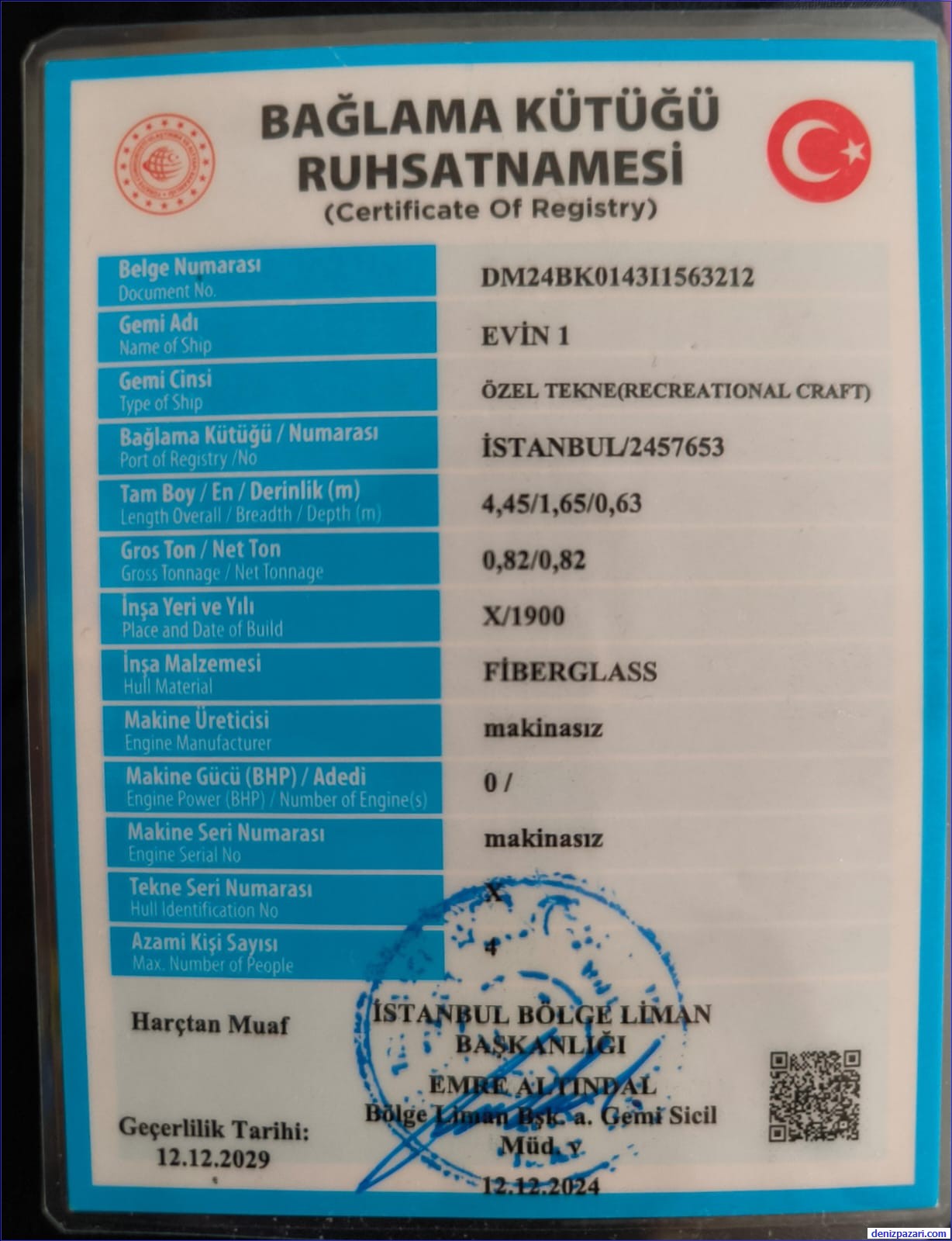 Tekne İstanbul Bölge Liman Başkanlığına kayıtlıdır.